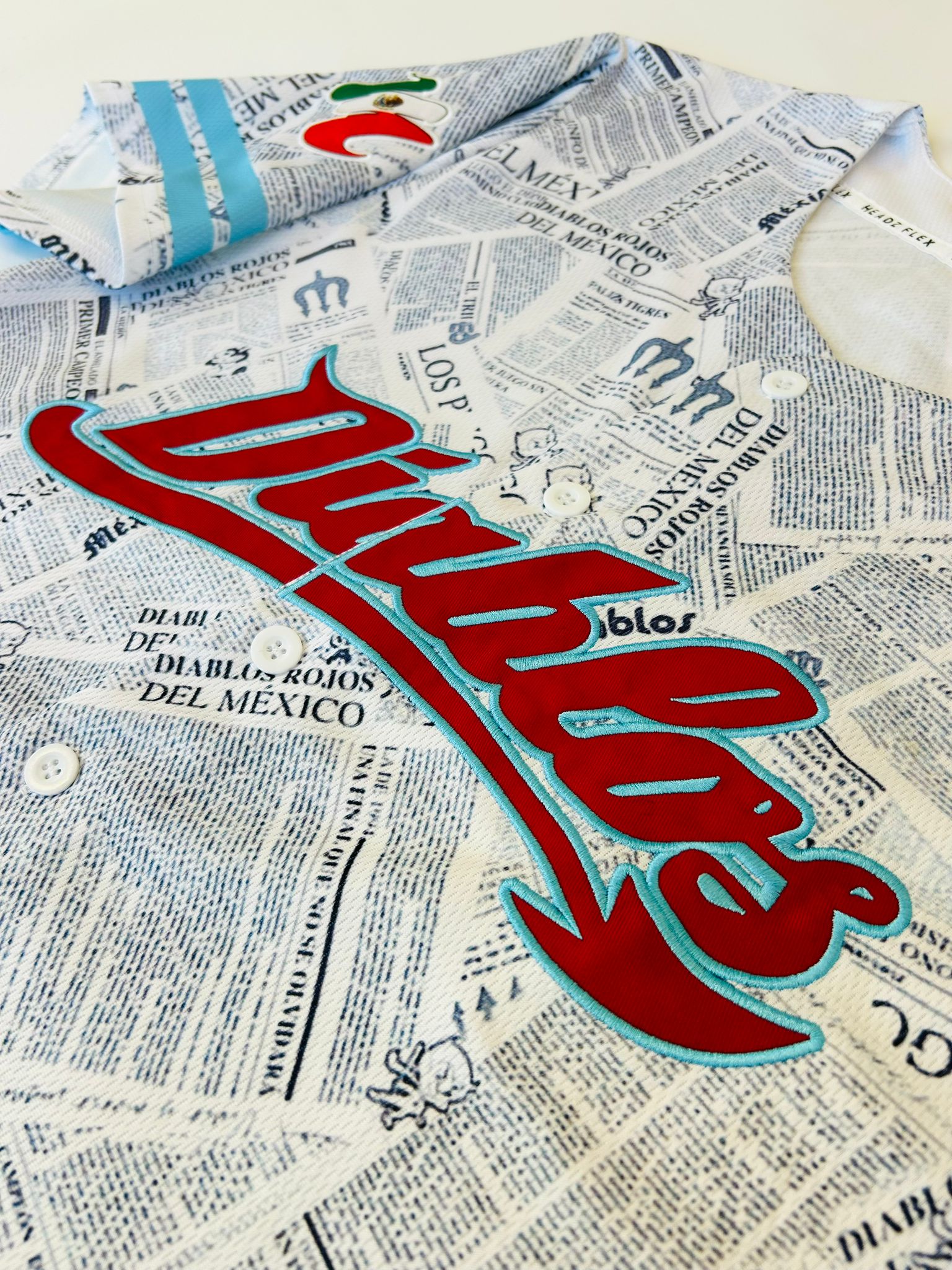 Experience the pinnacle of fan gear with our premium Diablos Rojos del México Baseball Jersey. Crafted with a unique newspaper print design, intricate Diablos on front across the chest embroidery, patches on the sleeve and high-quality fabric, this jersey is perfect for any true fan.