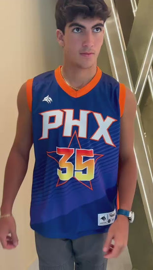 PHX 35 Basketball Jersey. This sleeveless jersey is made with high-quality mesh for breathability and comfort. It has bright blue and orange graphics and a prominent number 35. The PHX 35 Basketball Jersey is perfect for the court, gym, or everyday streetwear. Available in youth and adult sizes for a true fit. Machine washable for easy care and built for lasting wear. Give this PHX 35 Basketball Jersey as a gift to any basketball fan or add it to your collection for a standout look. Get yours today and stand out wherever you go!