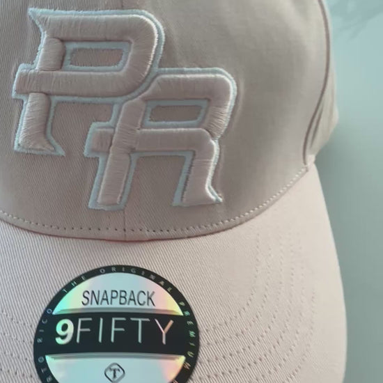 Pink Morro Premium PR 3D Pink Morro M-AGA embroidery, highlighting famous symbols like the historic Morro of San Juan, the iconic Coqui frog, vibrant Flor Maga flower, and a distinctive Puerto Rico map barcode. Soft pink color This Curved brim snapback cap is crafted to offer unmatched style and comfort, making it ideal for daily wear or special occasions to proudly display your Puerto Rican heritage.
