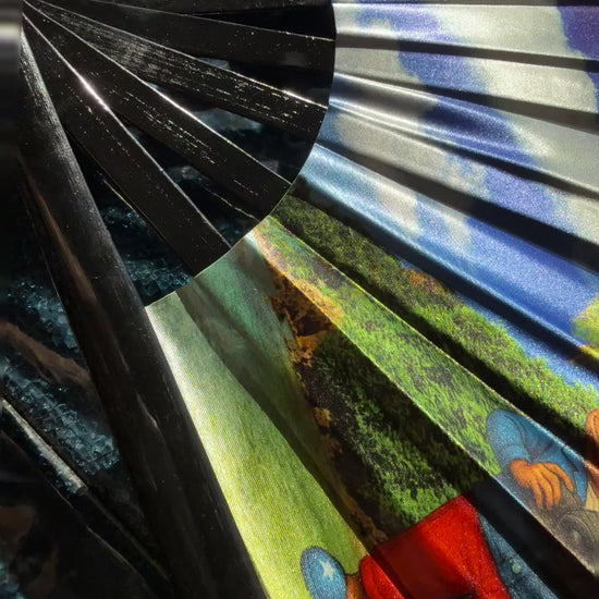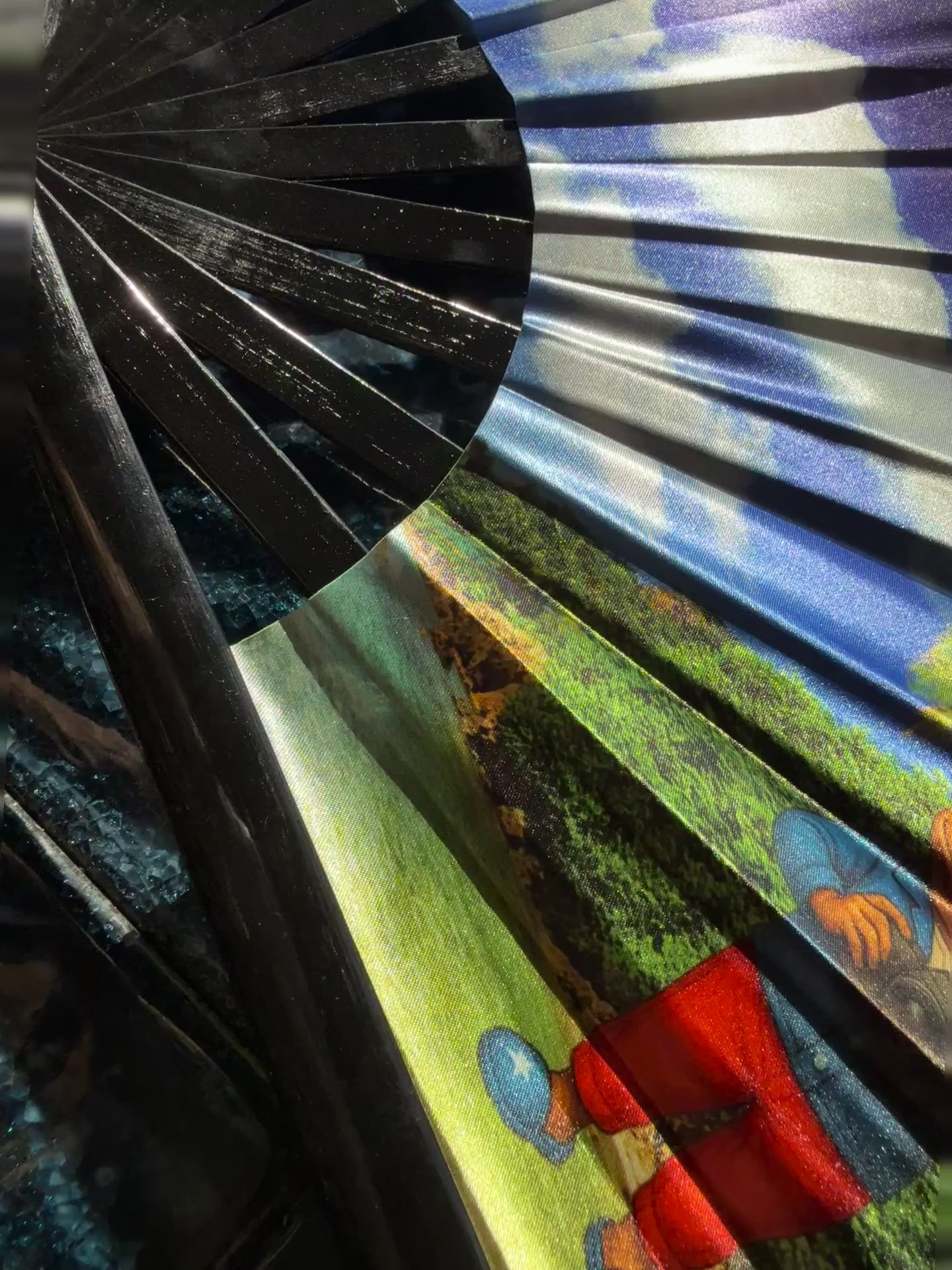 large bamboo nylon folding fan. Built for performance, this oversized hand fan delivers powerful airflow and a crisp, satisfying clack that pops on stage and on camera. Sturdy natural bamboo ribs and a reinforced pivot give you a strong, reliable frame; the smooth nylon leaf feels light in the hand yet tough enough for daily practice, travel, and long festival sets. Our vibrant, high-saturation colors are printed on exclusive artwork created in-house—no stock graphics—so your look stays unique from rehearsal to showtime.