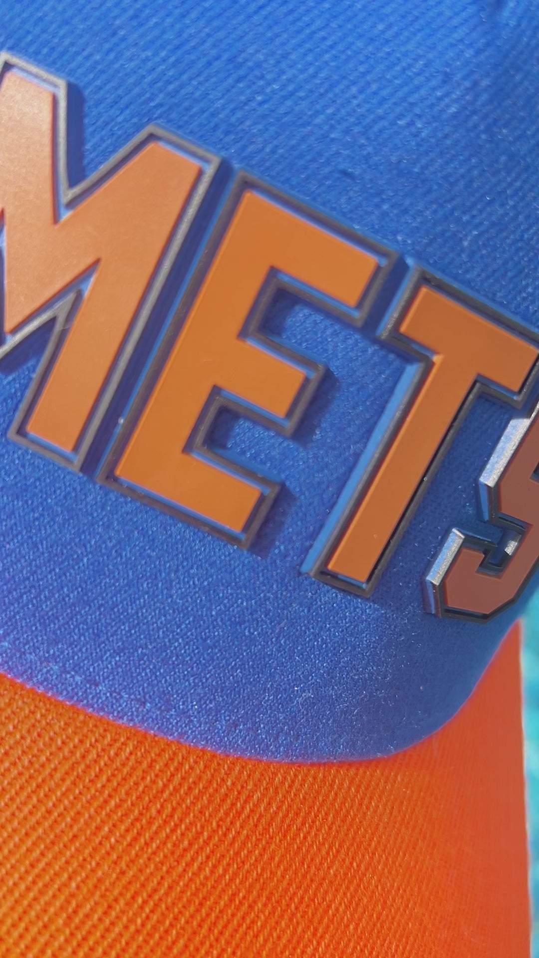 - Premium relaxed fit design with blue crown and orange brim in Mets colors