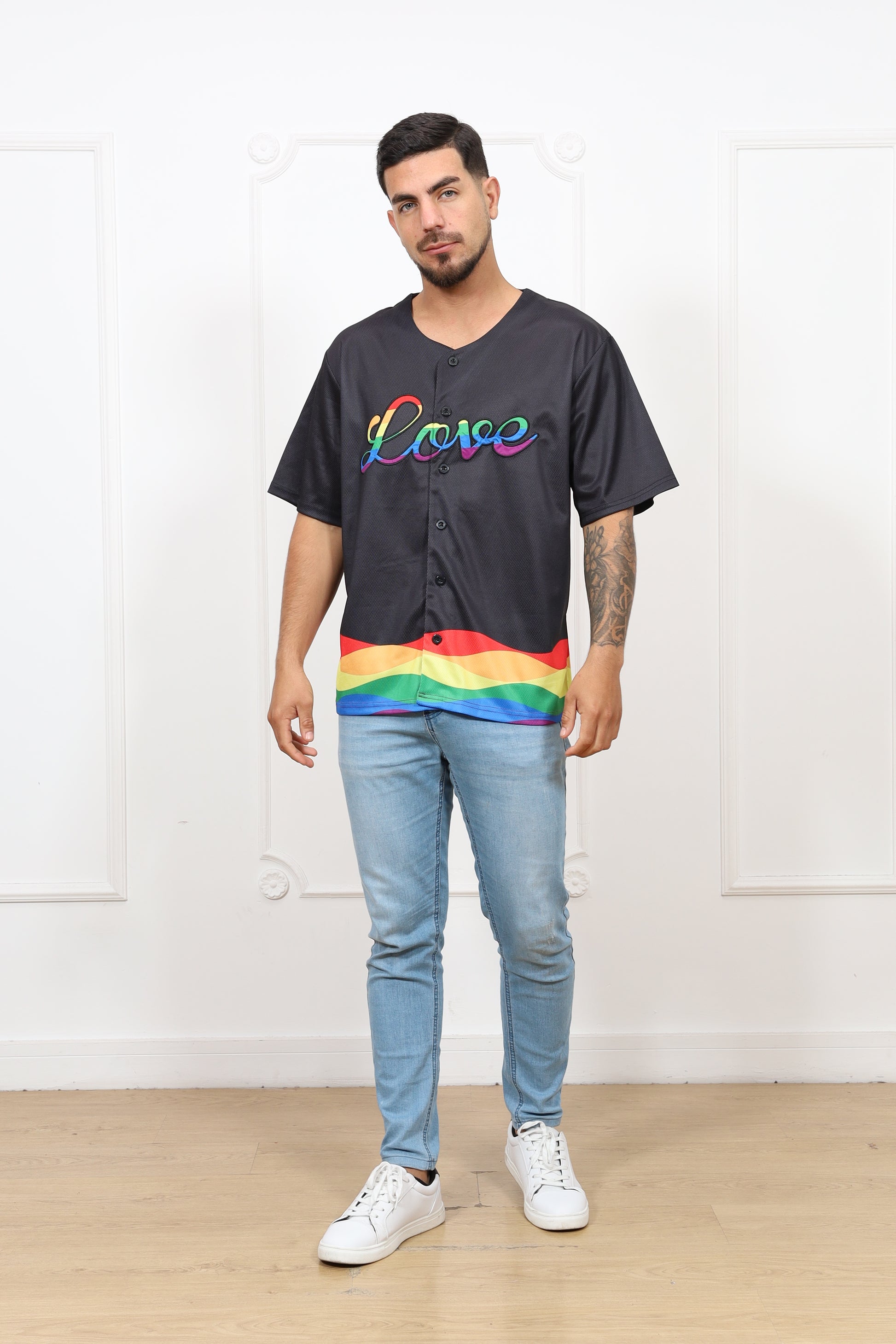 LOVE LGBTQ Black Baseball Jersey. This premium jersey features a vibrant rainbow design woven through the button-up front, with "love" embroidered boldly on the chest in rainbow colors on the back. Perfect for festivals, sports, or any occasion to show your pride.