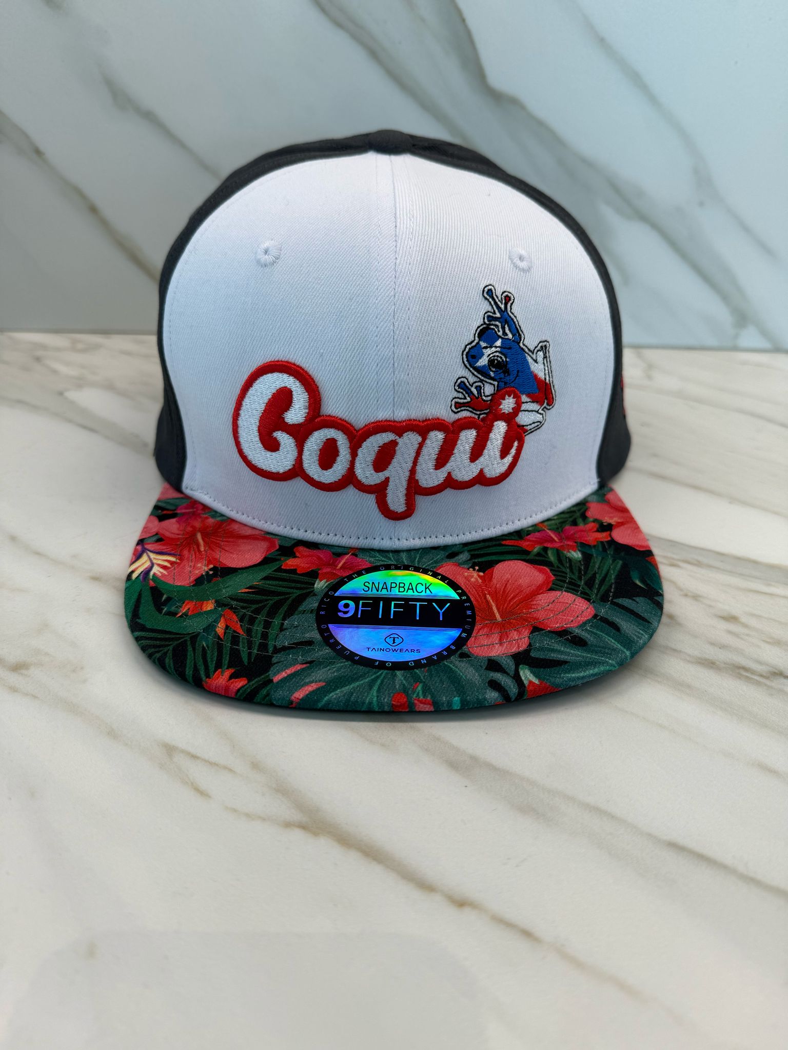 TAINOWEARS Puerto Rico Hat. Black PR 3D Embroidered Coqui in Vibrants color Red, Flatbill Snapback Cap, a special edition that celebrates the iconic symbols of La Isla. This premium cap features intricate embroidery of the Coqui , the national Floer, the Coqui, Flor M-aga, each symbolizing the rich culture and heritage of Puerto Rico. Crafted with high-quality materials for durability and comfort, this snapback cap is designed to make a statement wherever you go