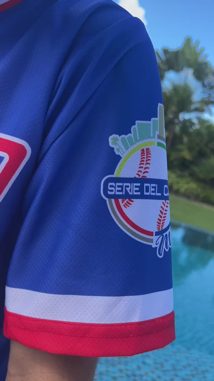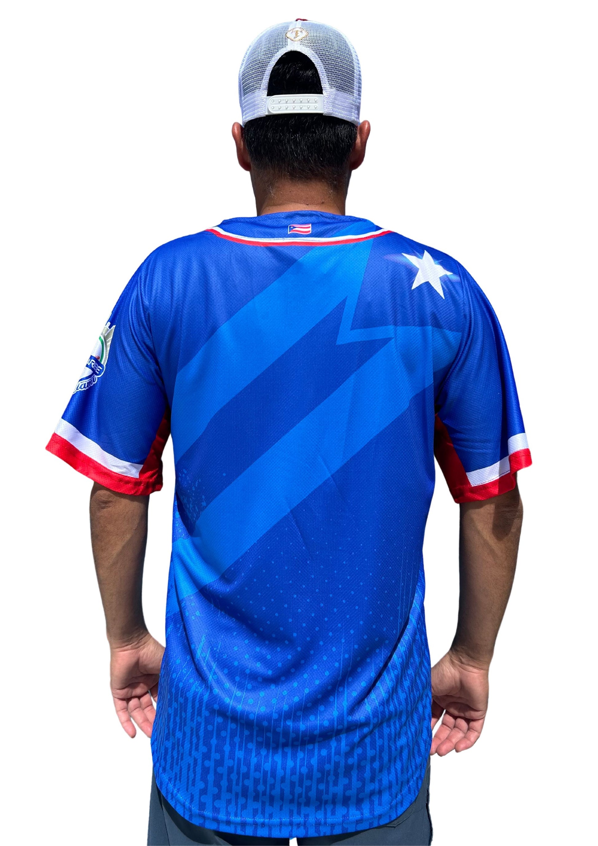 Tainowears Puerto Rico Serie del Caribe Baseball Jersey in Blue and Red. This striking jersey features 'Puerto Rico' embroidered across the front in the colors of the flag, while the back displays the iconic Puerto Rico star and flag in a translucent design. Crafted for both fans and fashion-forward individuals, this Puerto Rican flag baseball jersey blends sporty elegance with cultural pride.
