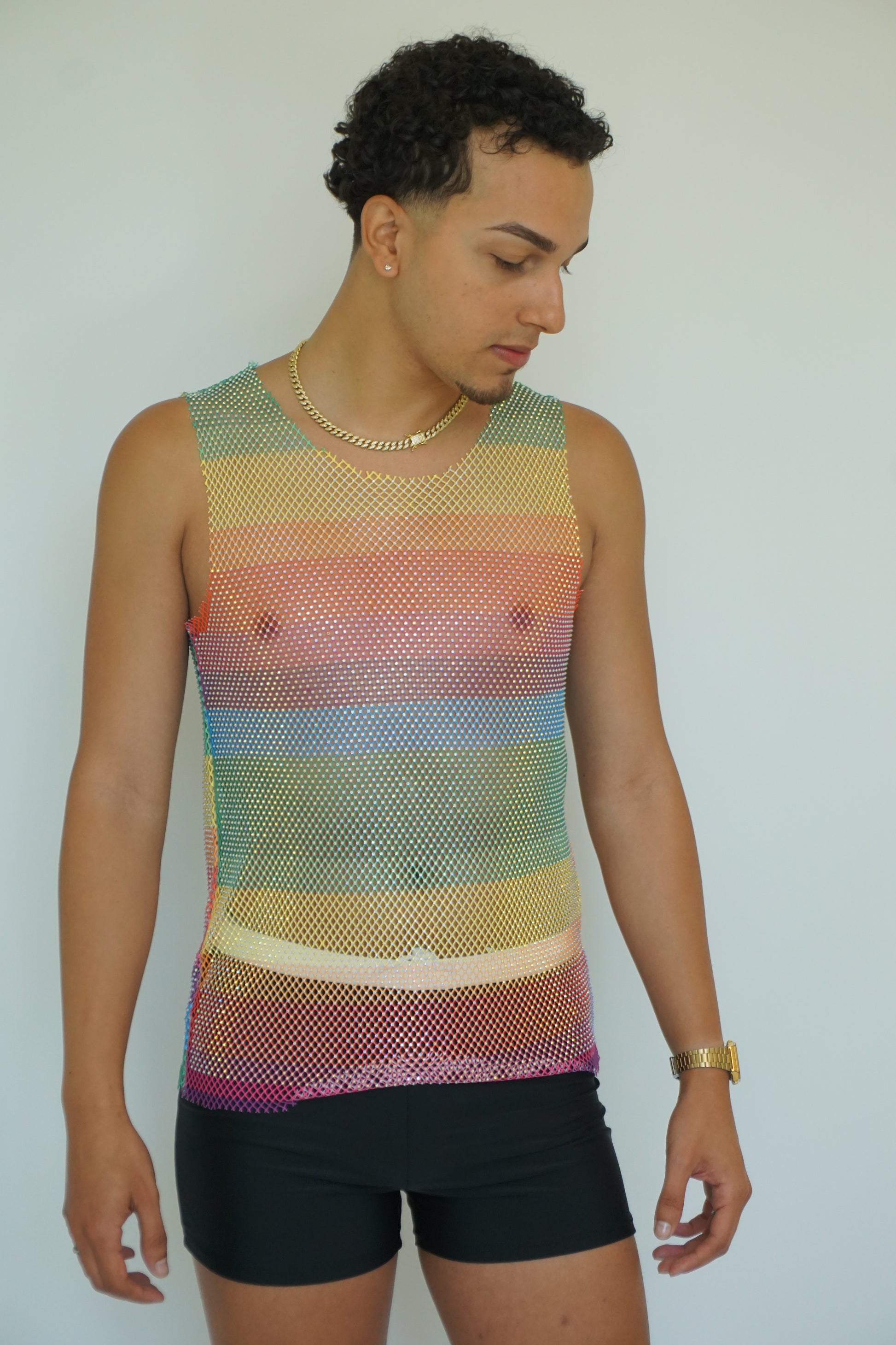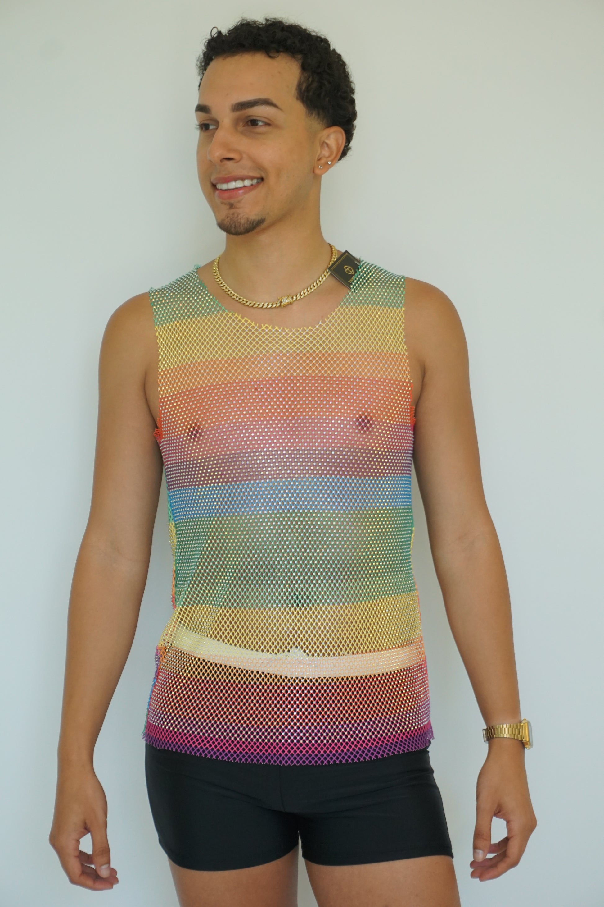 Rainbow Fishnet Long Tank Top by TAINOWEARS, a trendy and versatile sleeveless camisole perfect for making a bold fashion statement. This see-through mesh cover-up features a vibrant rainbow fishnet design, ideal for layering over your favorite bralette or swimsuit. Whether you're heading to the beach, a festival, or a casual day out, this stylish top adds a playful and eye-catching element to any outfit.