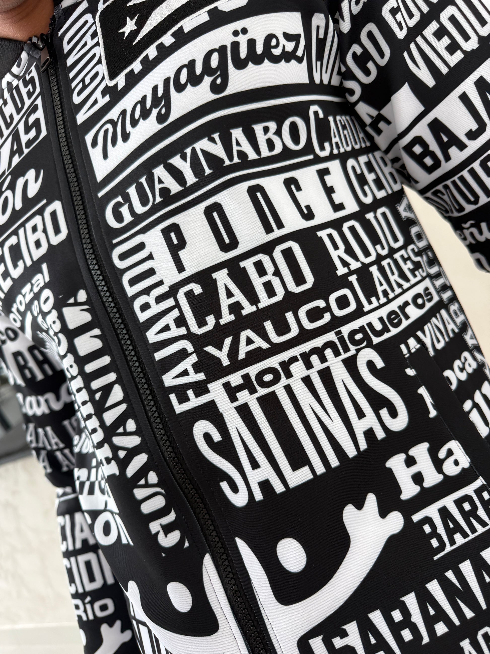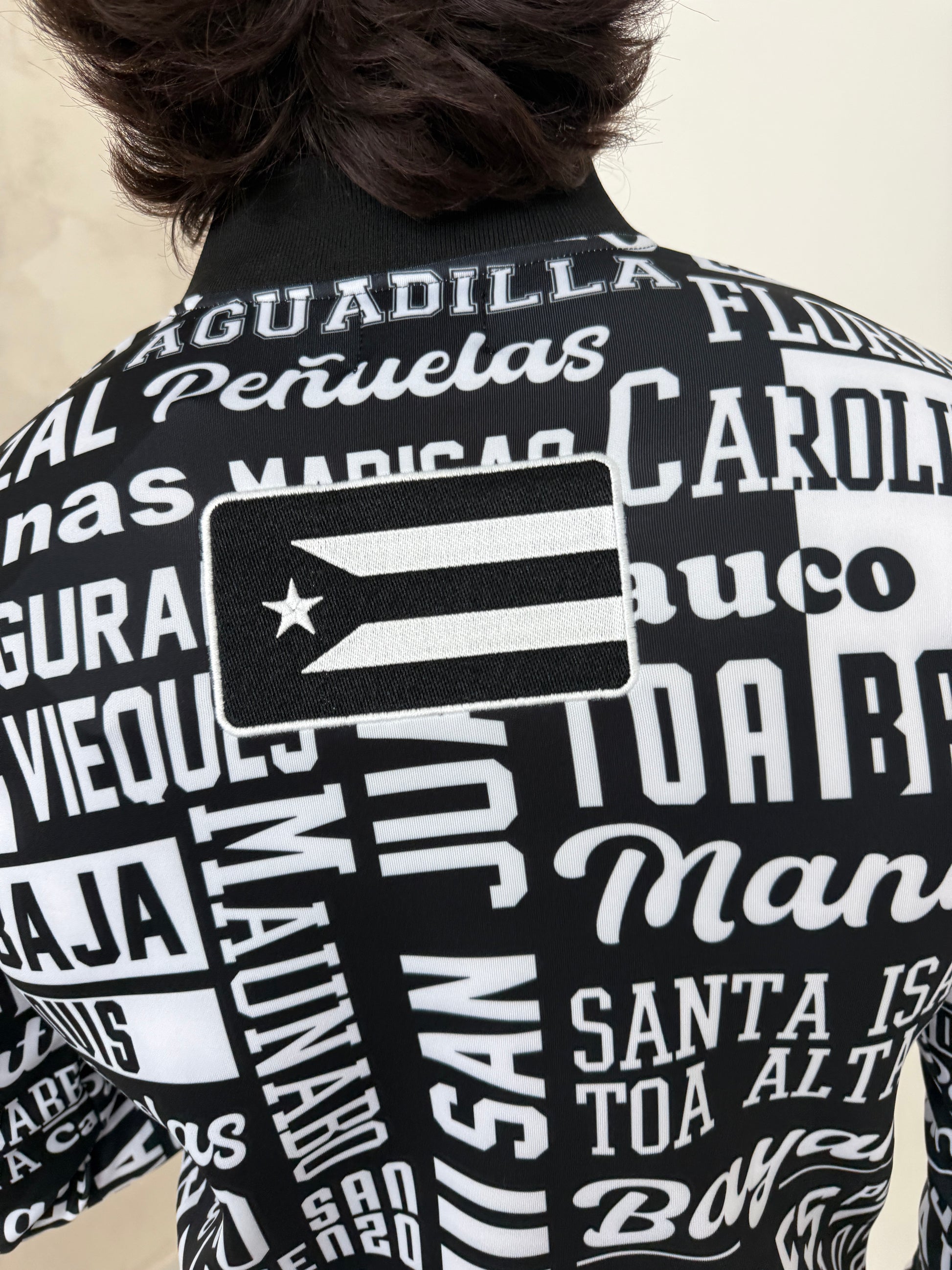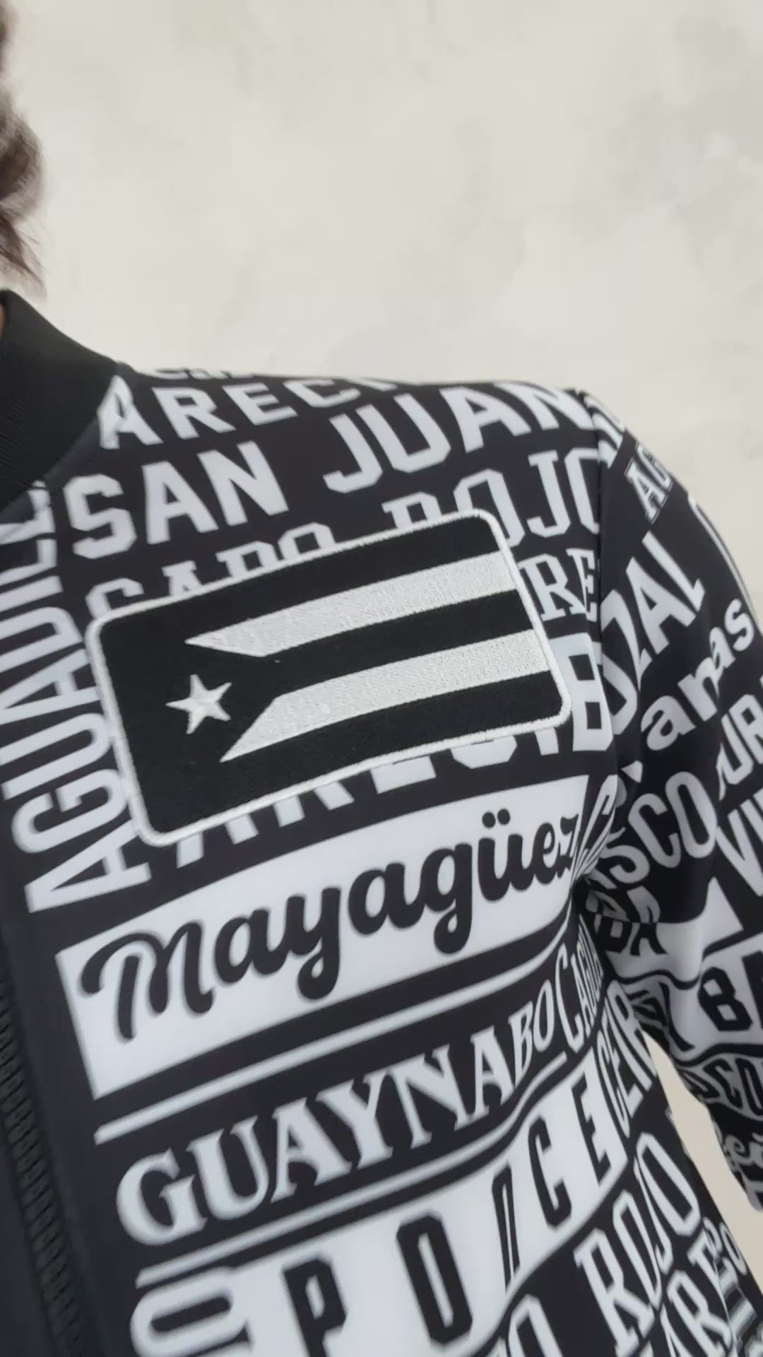 This unique black and white jacket features a striking all-over typography print showcasing the names of Puerto Rico’s municipalities, combined with embroidered Puerto Rican flags on both the front and back for an elevated premium look.
