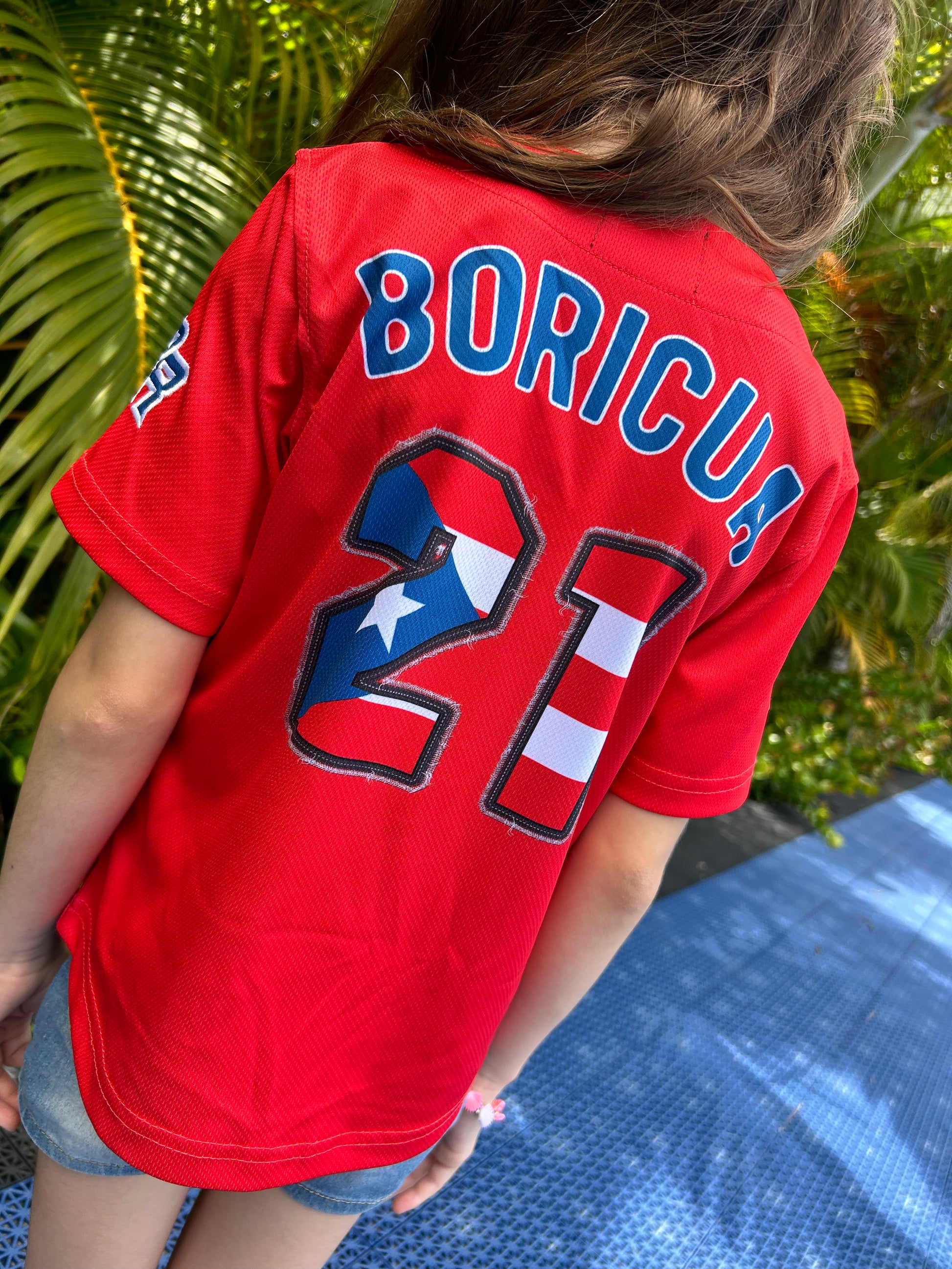 Puerto Rico Baseball Jersey in Red. Crafted from premium, lightweight materials, this high-quality jersey features bold "Puerto Rico" embroidery on the front, a Puerto Rican flag on the sleeve, and "Boricua" alongside the iconic "21" on the back. It’s a perfect tribute to Puerto Rican baseball legends.