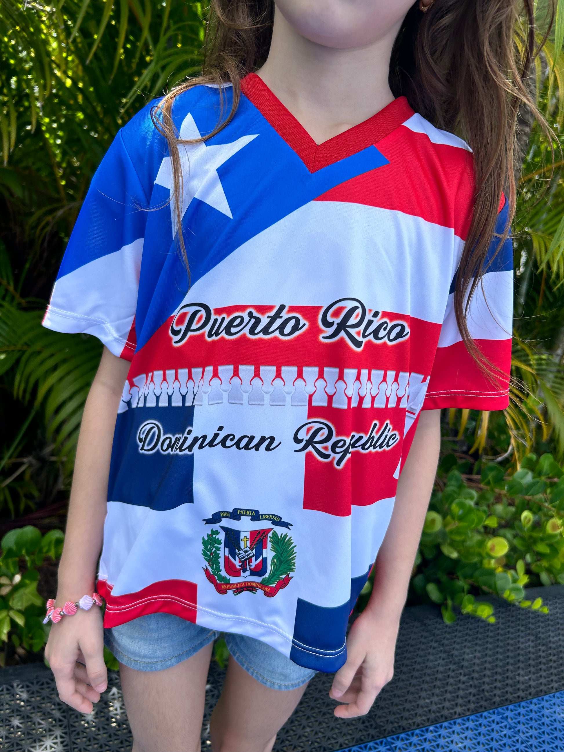 Puerto Rico-Dominican Republic Jersey. This unique, lightweight jersey showcases the flags of both Puerto Rico and the Dominican Republic, symbolizing a proud blend of cultures. Designed with short sleeves and crafted for comfort, this jersey is perfect for sports events, festivals, or any occasion where you want to represent your mixed heritage with pride.